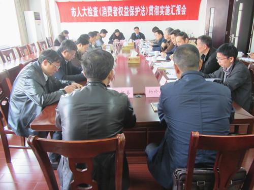根据市人大常委会关于检查《消费者权益保护法》贯彻执行情况的工作方案安排,4月8日上午,市人大常委会执法检查组在市人大机关会议室召开了贯彻实施《消费者权益保护法》情况汇报会。市消费者协会单祝安秘书长作《消费者权益保护法》辅导讲座,市市场监管局、法院、人民银行、经信委、住建局、商务局、旅游局、物价局、消费者协会等部门结合自身职能,分别作了专题汇报。
