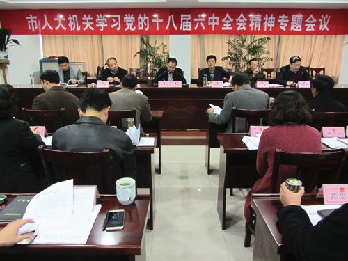 为深入学习贯彻党的十八届六中全会精神,进一步推动“两学一做”学习教育深入开展,11月18日上午,市人大机关组织学习党的十八届六中全会精神暨“做‘四讲四有’合格党员”大讨论活动。