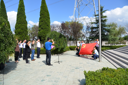 在新四军华中二分区革命烈士陵园,市人大常委会党组成员、办公室主任、机关党支部书记徐文凤向高耸的烈士纪念碑敬献了花篮,全体党员怀着崇敬的心情庄严宣誓,集体重温入党誓词。